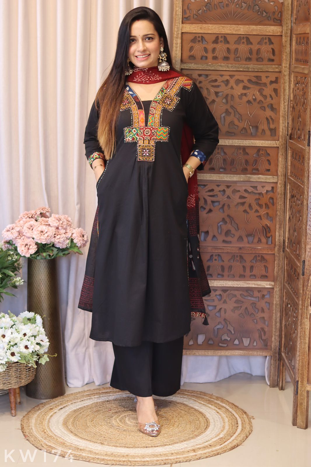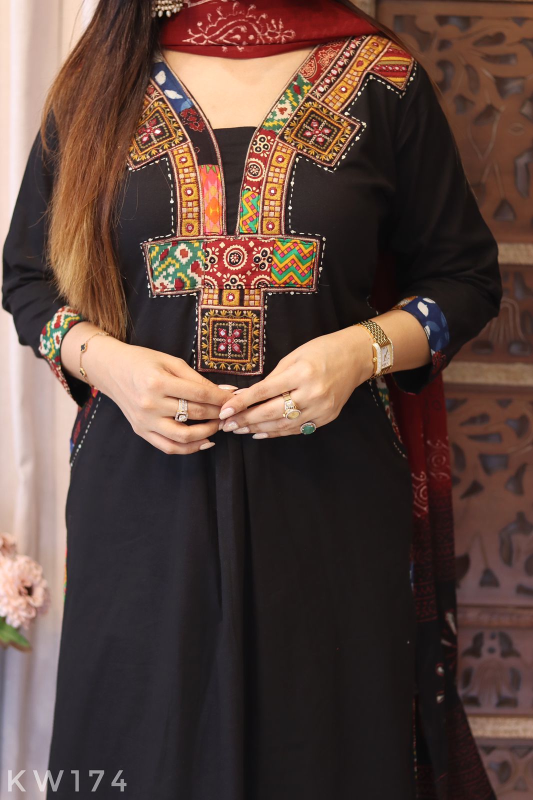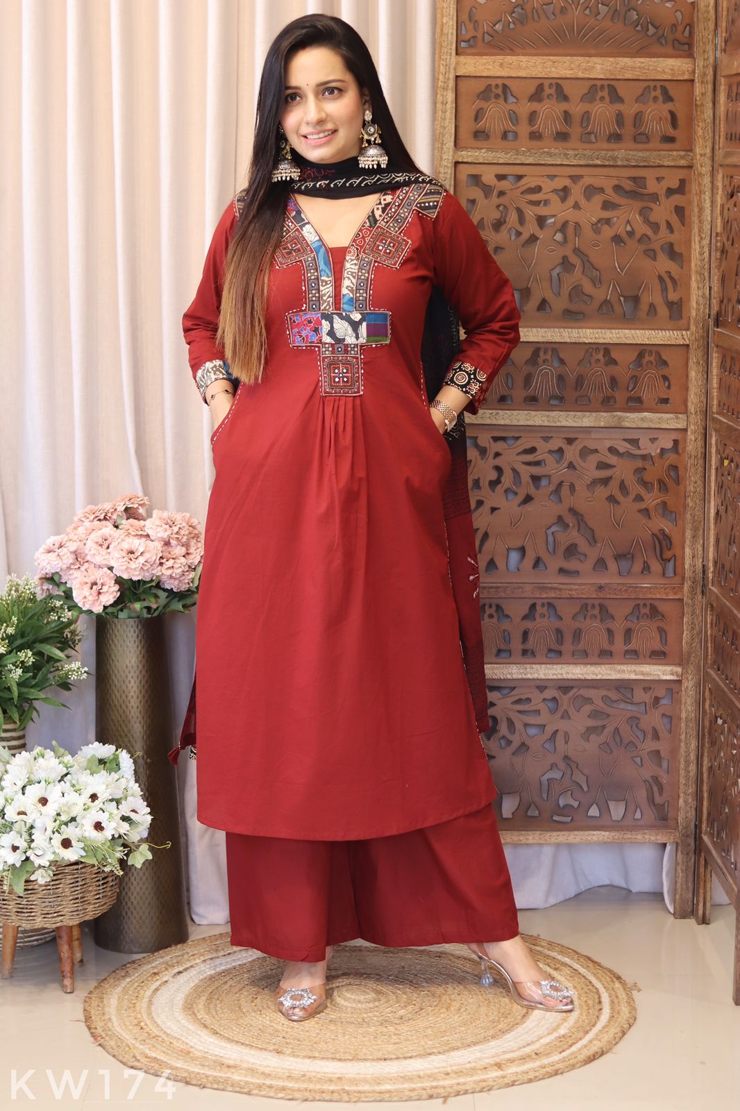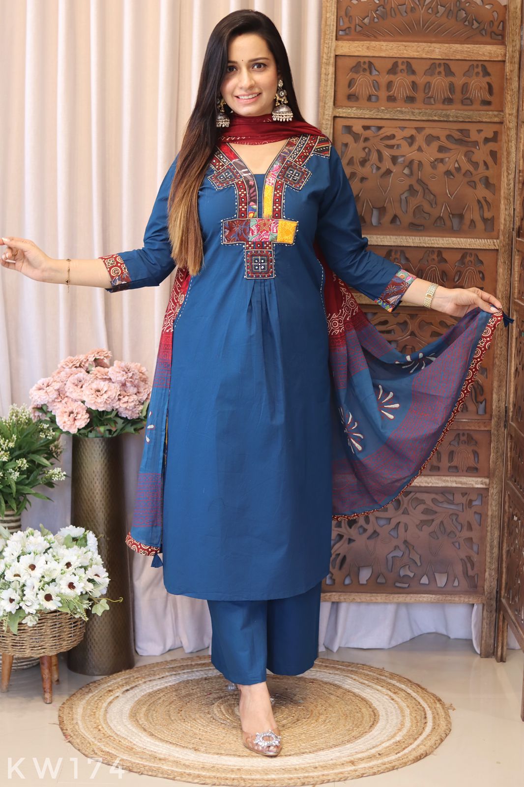 The Jodhpuri patchwork detailing and designer pockets add a sophisticated and traditional flair to the kurti, making it perfect for casual outings, festive occasions, and semi-formal gatherings. The coordinated pants and dupatta complete the look, giving you a graceful and cohesive outfit that’s as practical as it is pretty.