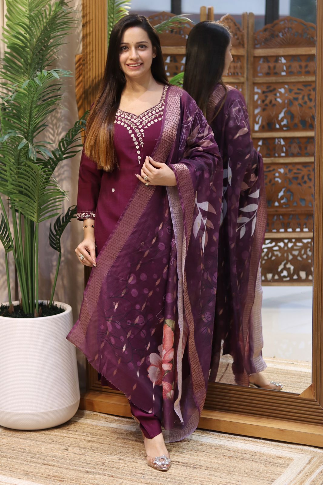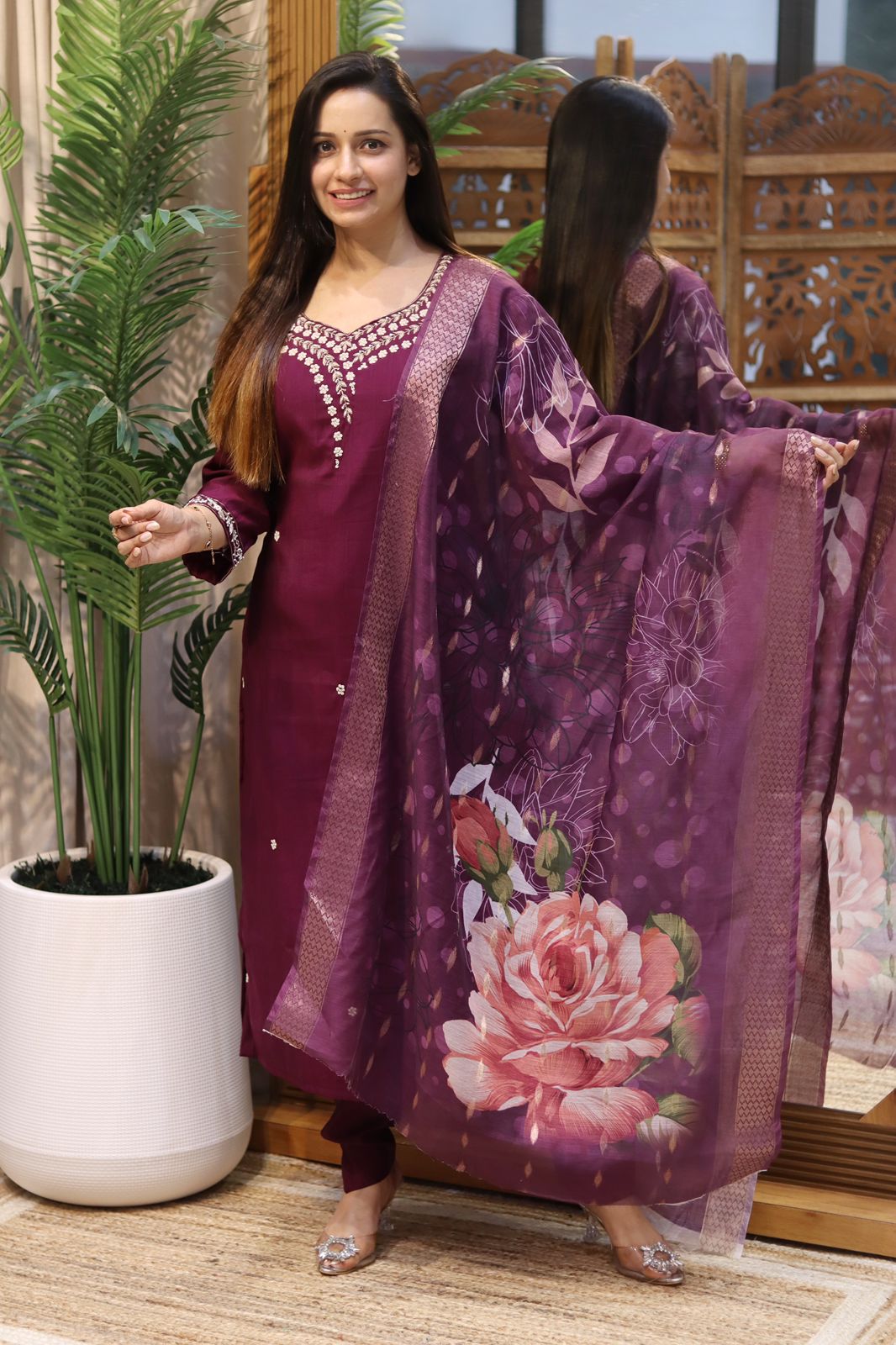 Paired with a premium printed organza dupatta, this ensemble adds a touch of contemporary charm, while the matching pant ensures a coordinated and comfortable look. The rich texture of South Silk combined with the lightweight organza makes this outfit both breathable and beautiful.